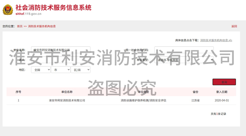 淮安市利安消防技术有限公司成立于二0一0年,目前满足2019年8月29日,应急管理部颁布《消防技术服务机构从业条件》,已在江苏消防网注册备案,可以从事消防设施的检测、维修保养、消防评估,且取得江苏省建委颁发的消防设施工程专业承包贰级资质证书,可从事消防设施安装。